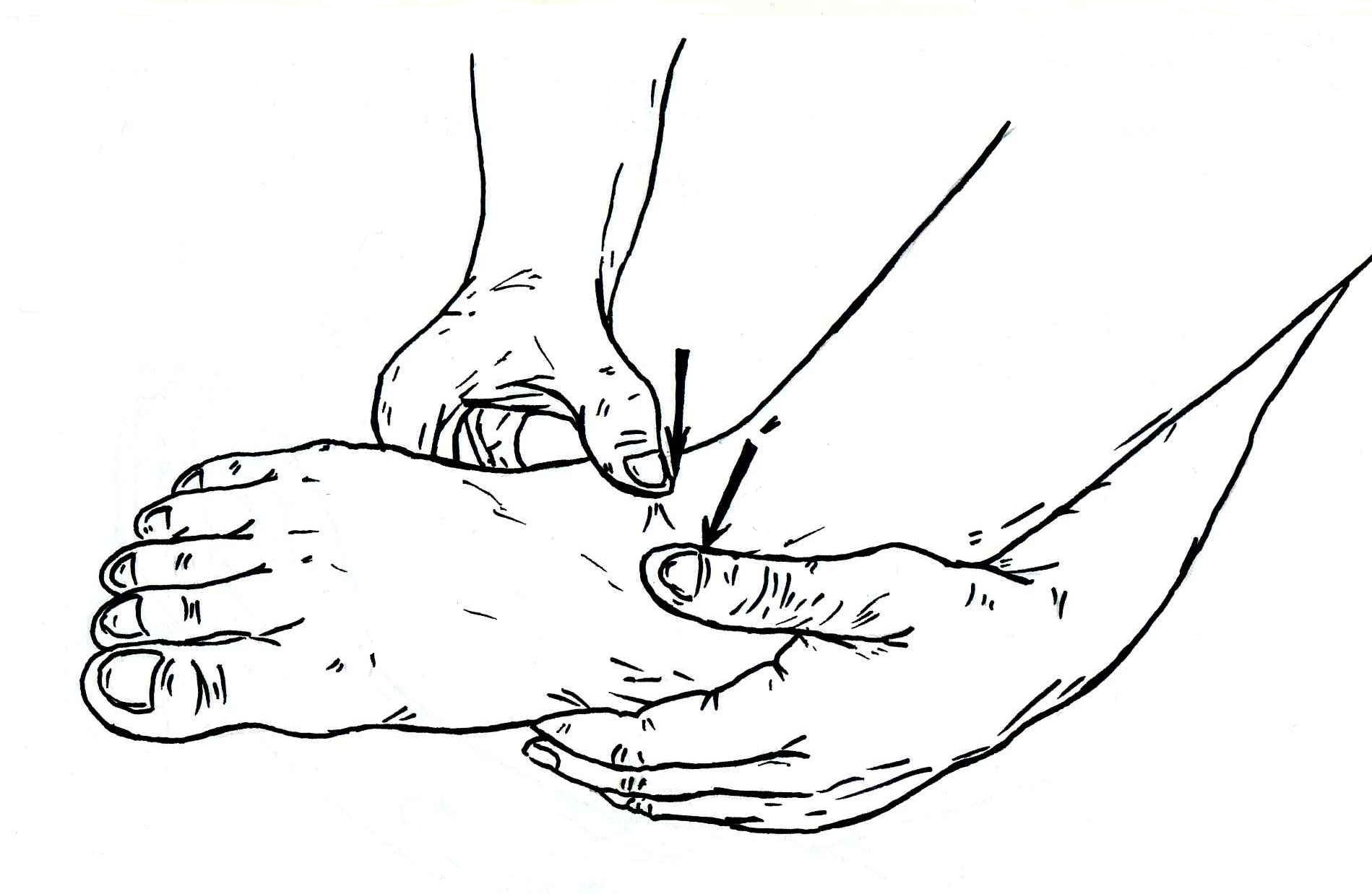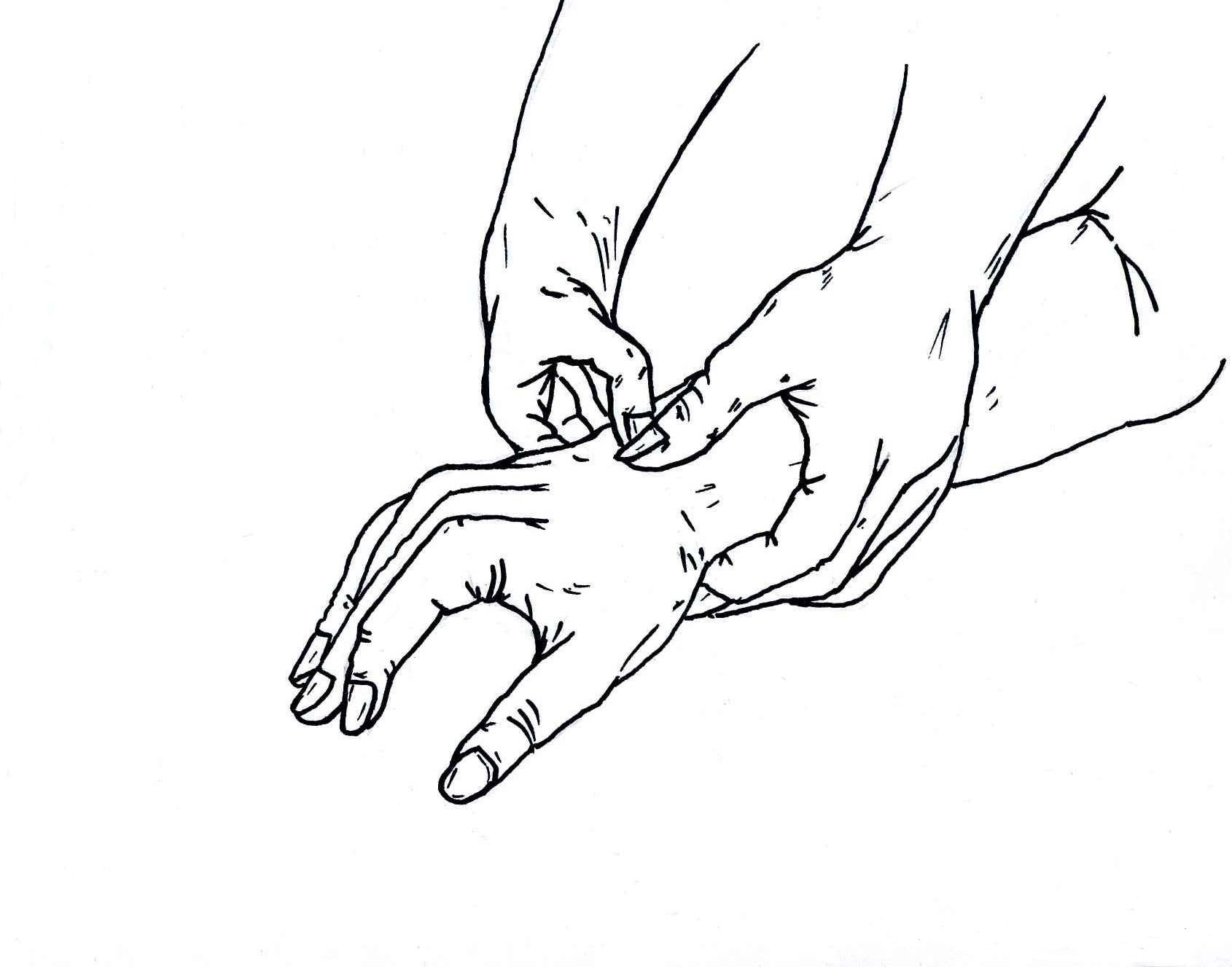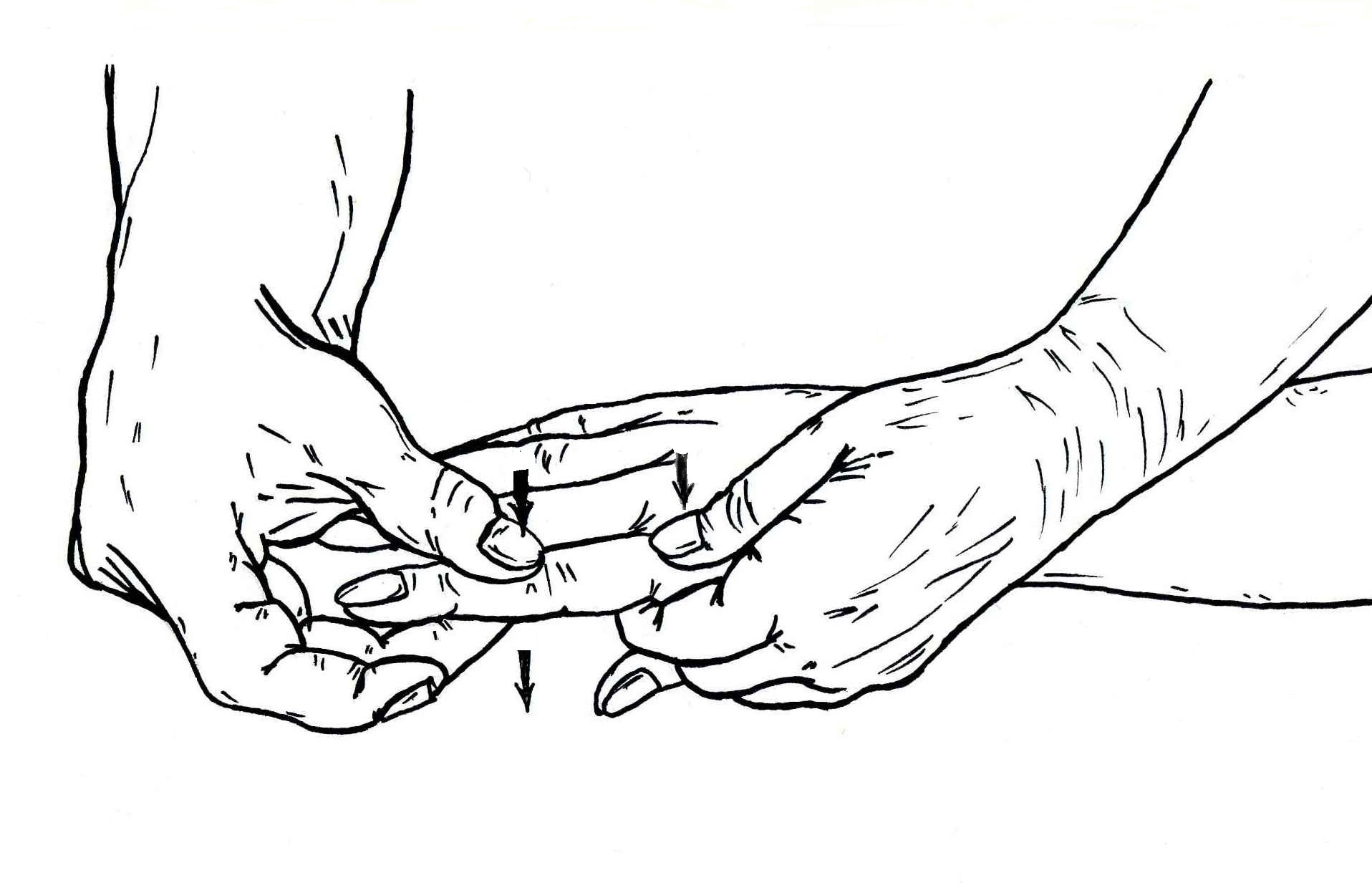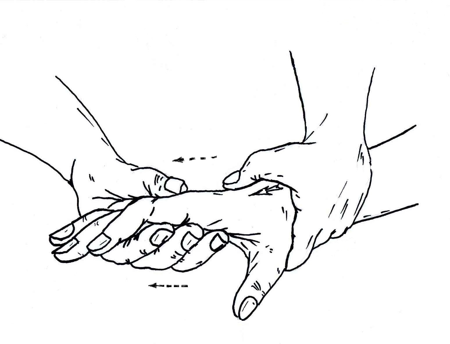 Затем большими пальцами она надавливает на руку в запястье (как на Рис. 1), производя массирующие движения.