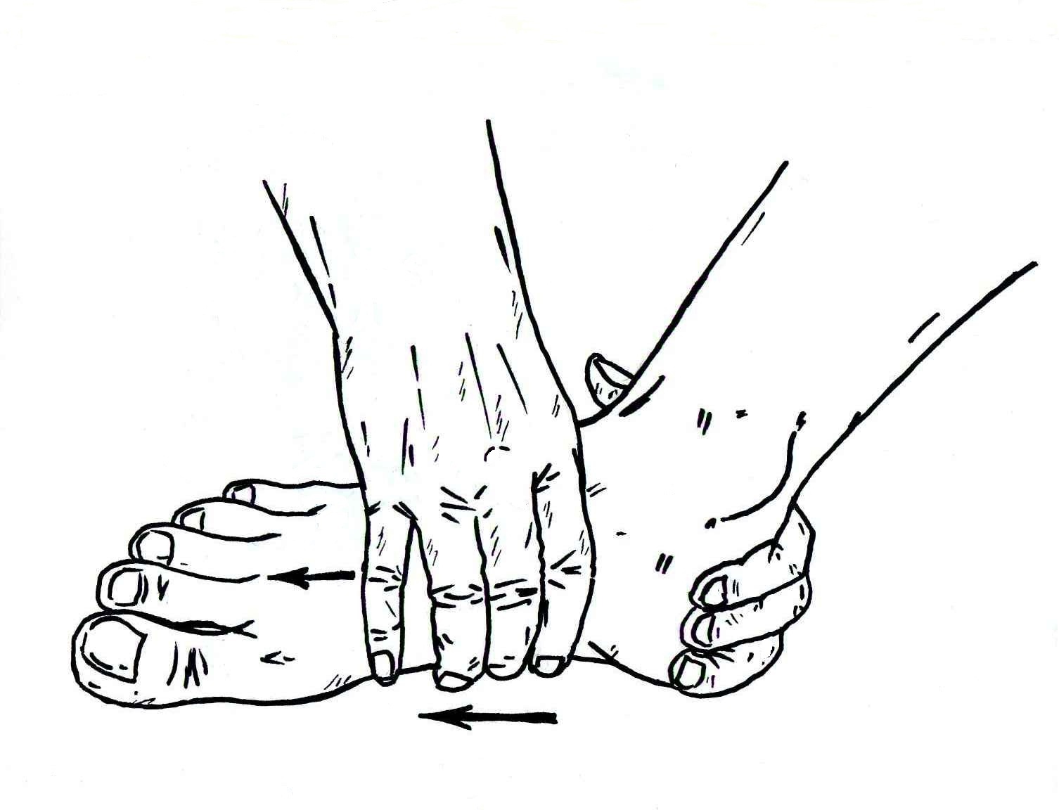 Затем опорной рукой она фиксирует ногу, держась за пятку, другой мягко дергает за стопу вперед несколько раз. Если сустав вывихнут, должен раздастся хруст (Рис. 4).