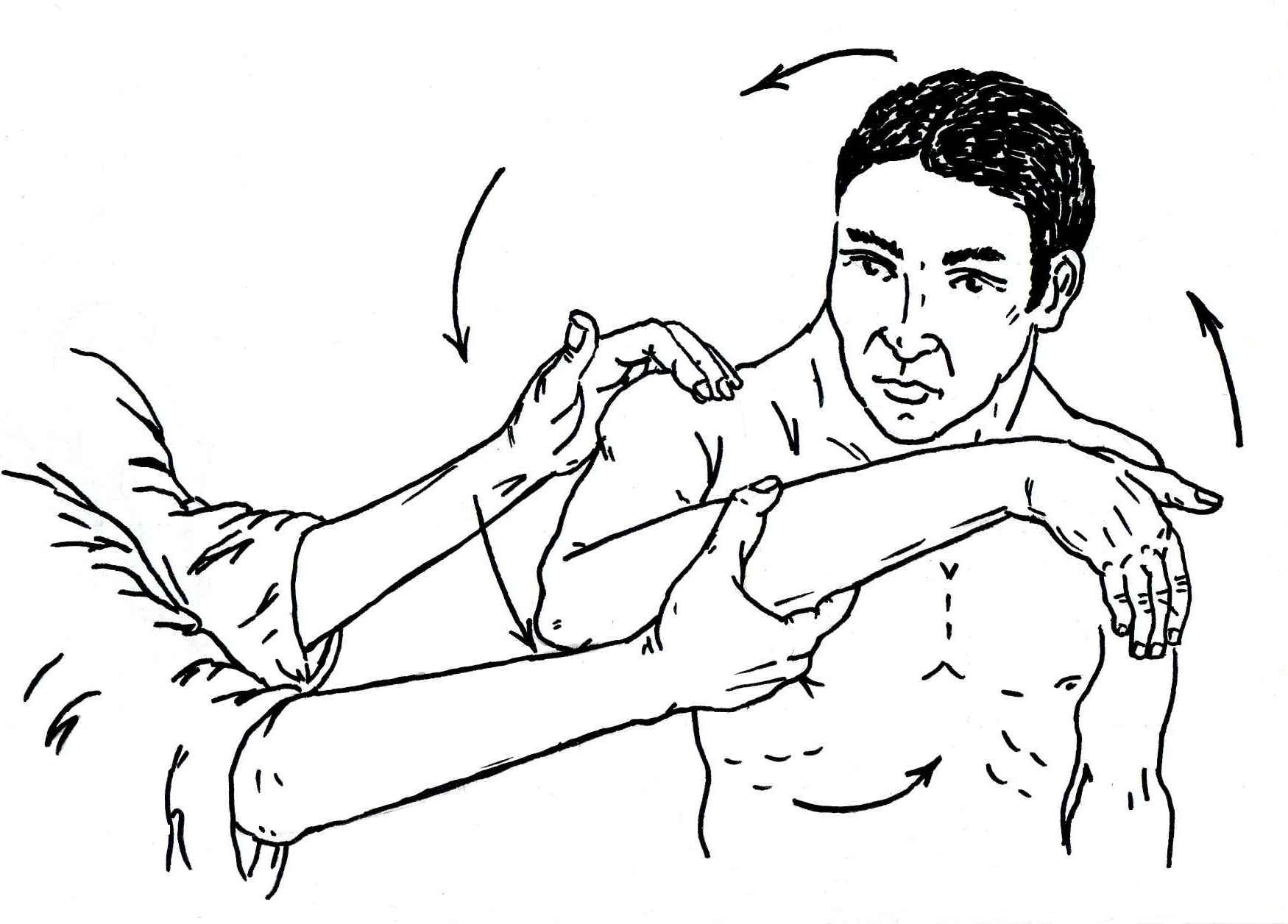 Если пациент обратился с вывихом плеча (в плечевом суставе), то движения по вправлению сустава следующие: одну руку она кладет на плечо, фиксируя кость, другой берется за руку пациента и несколько раз делает ей круговые движения. Та «косточка», которая «вывихнута», даст «сигнал» – она хрустнет (Рис. 7).