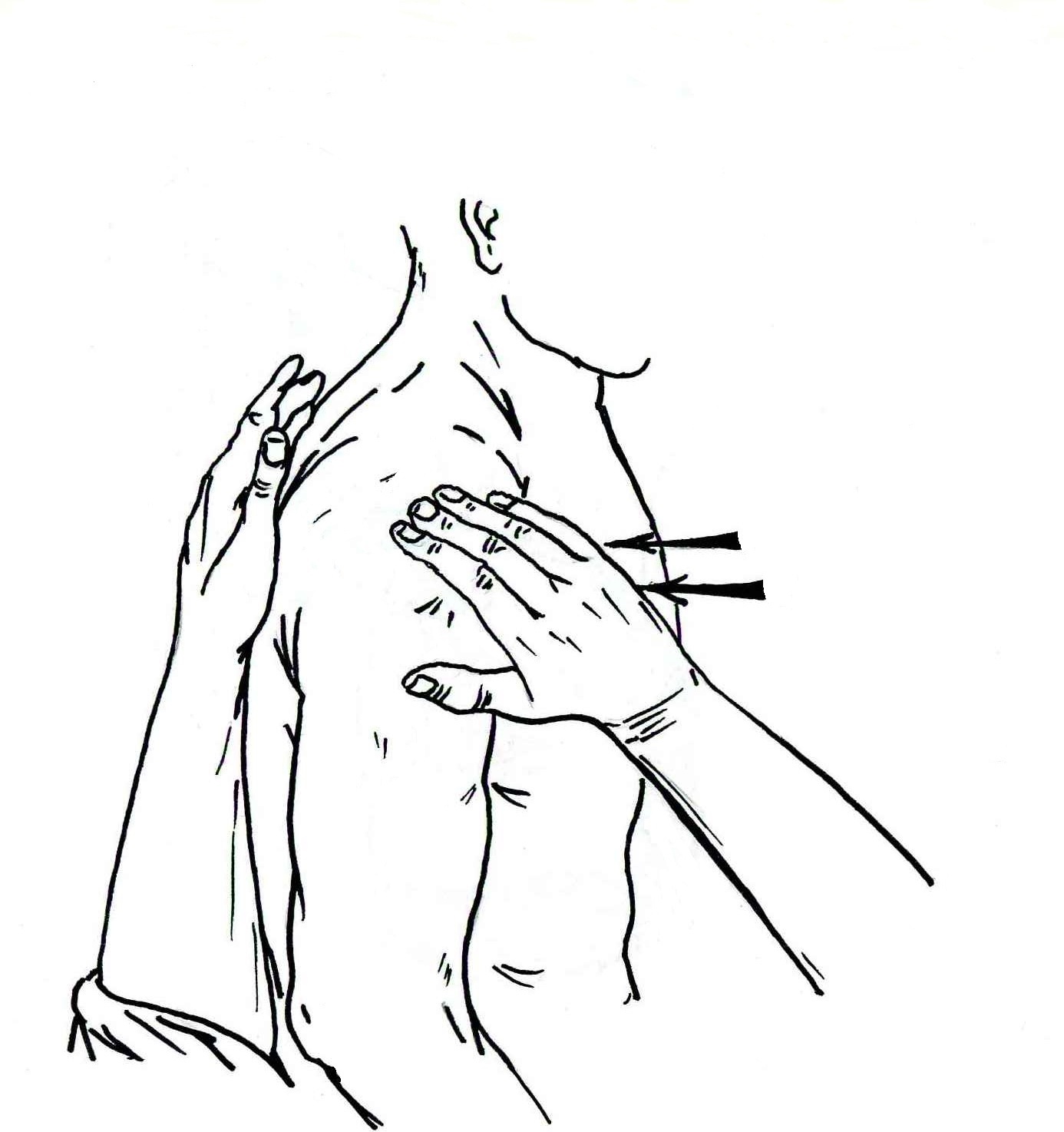 После этого М.С. Чеснокова массажирует плечо: кладет на него ладонь (со стороны грудины) и делает выжимающие движения со смещением назад к спине. Их сила зависит от возраста и в целом состояния пациента: одним делает достаточно сильно, другим – менее сильно (Рис. 8).