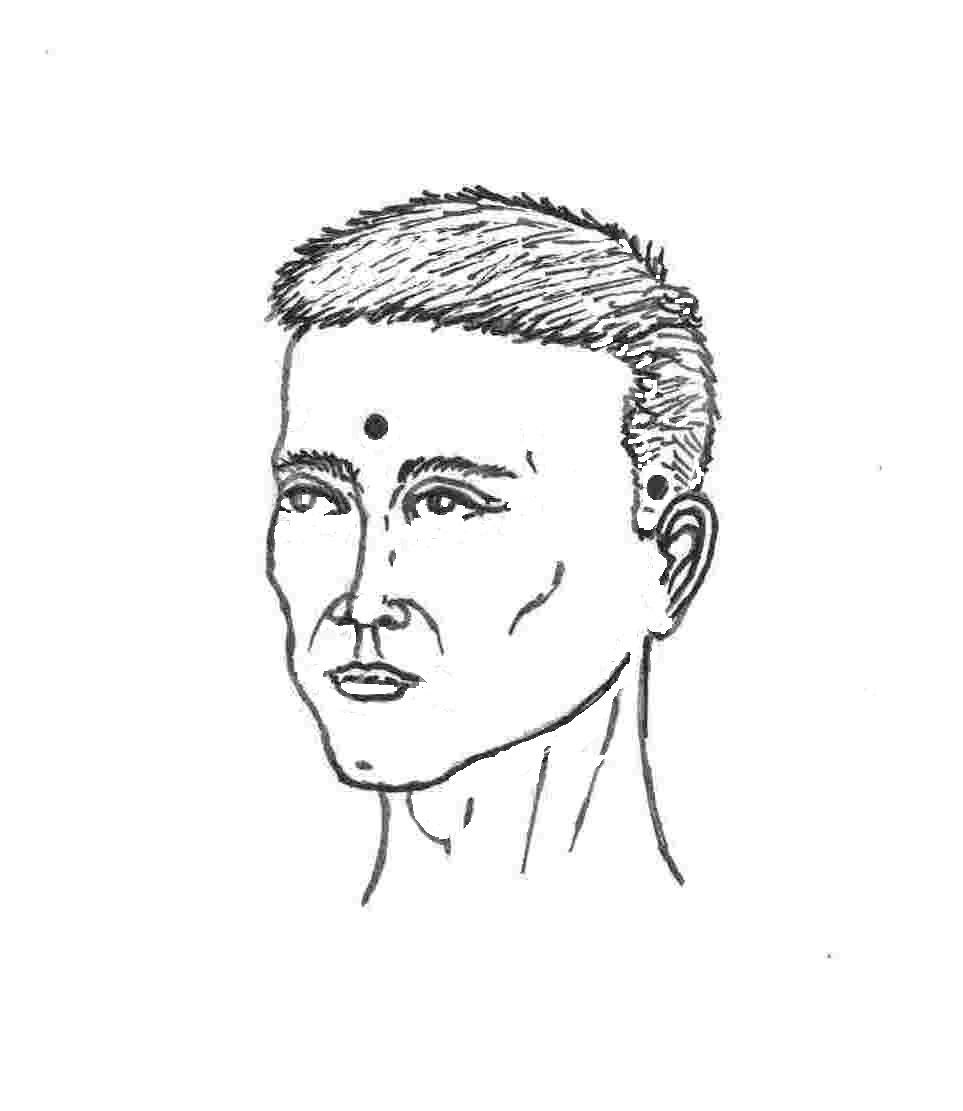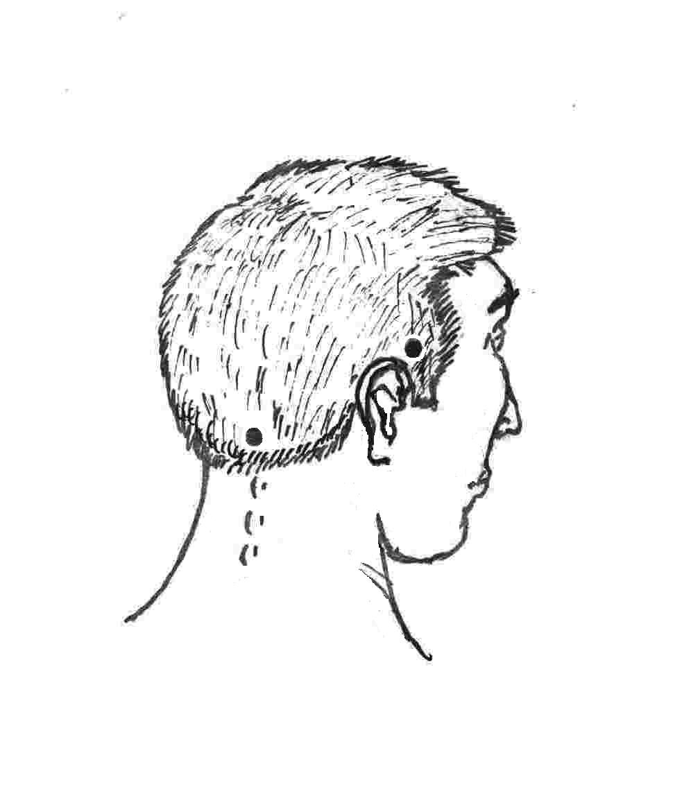 Частыми были травмы черепа – ушибы мягких тканей головы. При травме черепа правили голову. Обряд лечения продемонстрировала Н.Н. Подколзина. Берется тряпочка белого цвета такой длины, чтобы обхватить ей всю голову. Два конца тряпочки сводятся вместе на затылке, примерно у ямочки в основании черепа. Метки ставятся углем или сажей (берется на палец с внутренней стороны дверки печи) в трех местах: над переносицей и чуть выше треугольной ямки ушей («над височком») (Рис. 9).