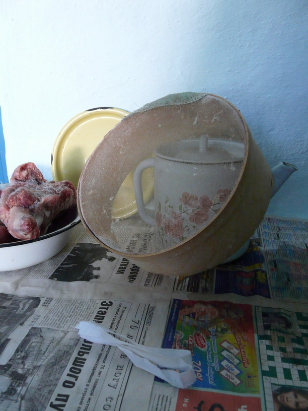 Важна параллельность нанесения меток. Затем тряпочка снимается, при этом лекарь, не отпуская, держит ее одной рукой за концы, другой – за метку, нанесенную над переносицей. Уже на этом этапе он может сказать, «стрёхнутая» голова или нет. Если голова «стрёхнутая», одна часть тряпочки провисает. Однако тряпочка на этом этапе диагностики может и не показать травму головы. Симптомом травмы являлась также высокая температура. Затем концы тряпочки соединяются с противоположной частью – с меткой над переносицей, и тряпочка складывается в два раза. При этом часть, где проставлена метка над переносицей, размещается между концами тряпочки. Получается, что тряпочка состоит из двух частей, на каждой из них нанесены «ушные» метки. Одной рукой лекарь держит концы тряпочки вместе с «лобной» меткой, другой рукой он держит тряпочку на месте «ушной» метки. Так проверяет обе части тряпочки. Если тряпочка провисает с одной или двух сторон, значит, голова «сбита», и именно на это «пространство». Нужно голову править, и лекарь предлагает «шибануть» голову с помощью сита. Процедура болезненная. Пациент должен сидеть на твердой поверхности, например, на табуретке. Сито пациент берет в зубы (Рис. 10).