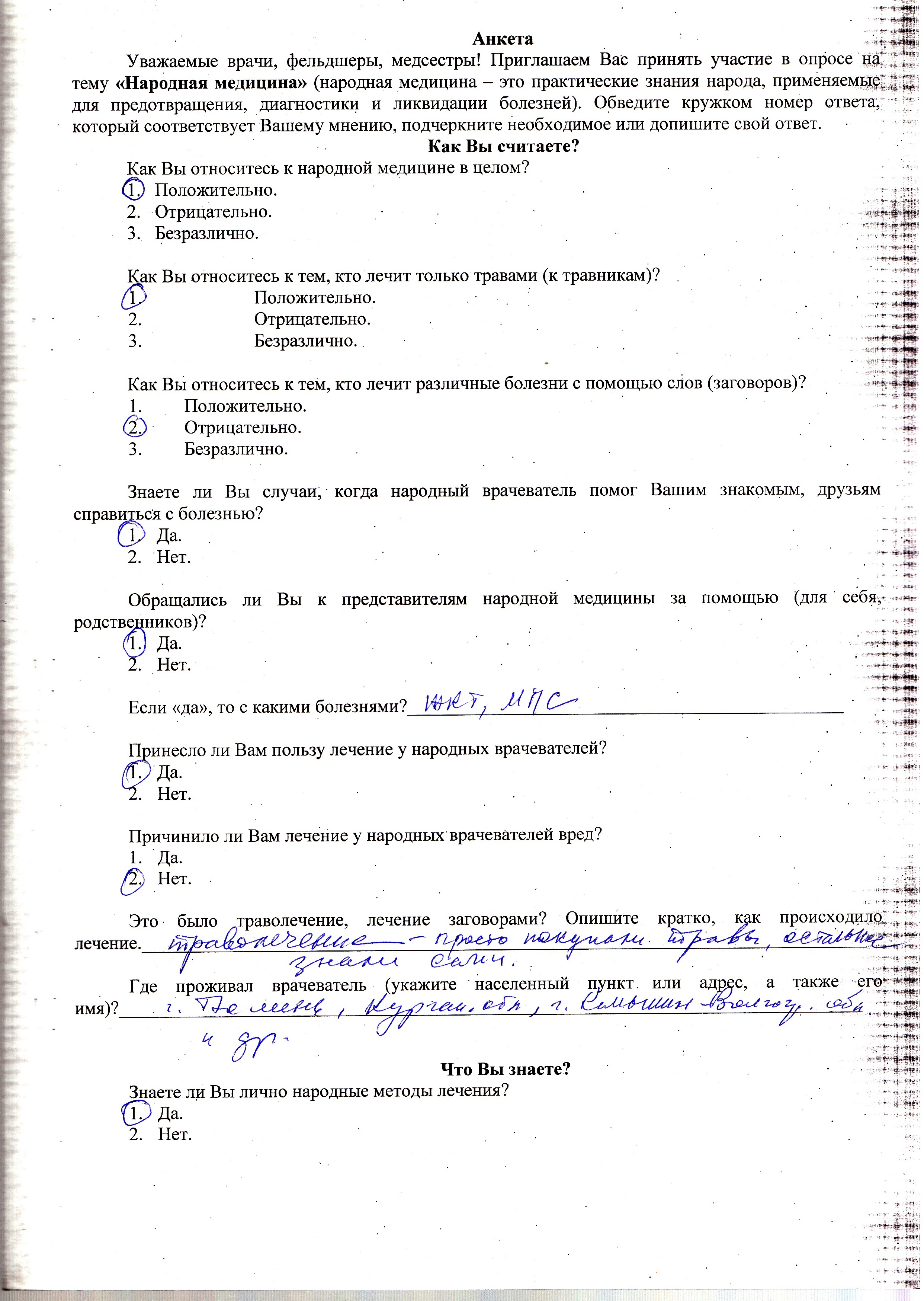 В целом вопросы анкеты можно отнести к трем типам. Во-первых, это группа «Что Вы думаете?», куда вошли вопросы, раскрывающие отношение медиков к народной медицине и опыт обращения к услугам ее представителей. Во-вторых, это группа вопросов «Что Вы знаете?», направленная на выяснение собственного опыта опрашиваемых в применении ими средств народной медицины и на знание конкретных представителей неконвенциональной медицины (лекарей, врачевателей). В-третьих, в группу вопросов «Кто Вы?» вошли следующие медико-демографические и социальные идентификаторы: пол, возраст, образование, профессия, место жительства и национальность. В «коротких» анкетах вопрос о национальной принадлежности респондента был исключен в связи с тем, что подавляющее число опрошенных – русские, все остальные национальности представлены единично. Кроме того, многие оставили данную графу незаполненной. Таким образом, этот вопрос в исследовании оказался нерелевантным.