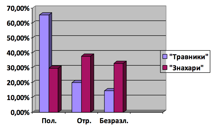 Дополнительно в «длинных» анкетах было введено условное разделение медицинских специалистов на «травников» (кто лечит только травами) и «знахарей» (тех, кто лечит различные болезни с помощью слов – заговорами, молитвами). Кроме того, это разделение было достаточно провокационным, т.к. я заранее предполагала, какие будут результаты; но все же интересно было процентное соотношение. В целом положительно относятся к «травникам» 65,5%, к «знахарям» – 29,8% из числа опрошенных. Соответствующей будет и доля негативно настроенных: к «травникам» отрицательно относятся 20%, в «знахарям» – 37,3%. Безразлично относятся к «травникам» 14,5% опрошенных, к «знахарям» – 32,9%. Кстати, высокое доверие именно к «травникам», к траволечению было отмечено также в опросе А.В. Худякова, в котором 67% врачей рекомендовали своим пациентам средства этого нелекарственного метода лечения (Худяков 2013: 133).