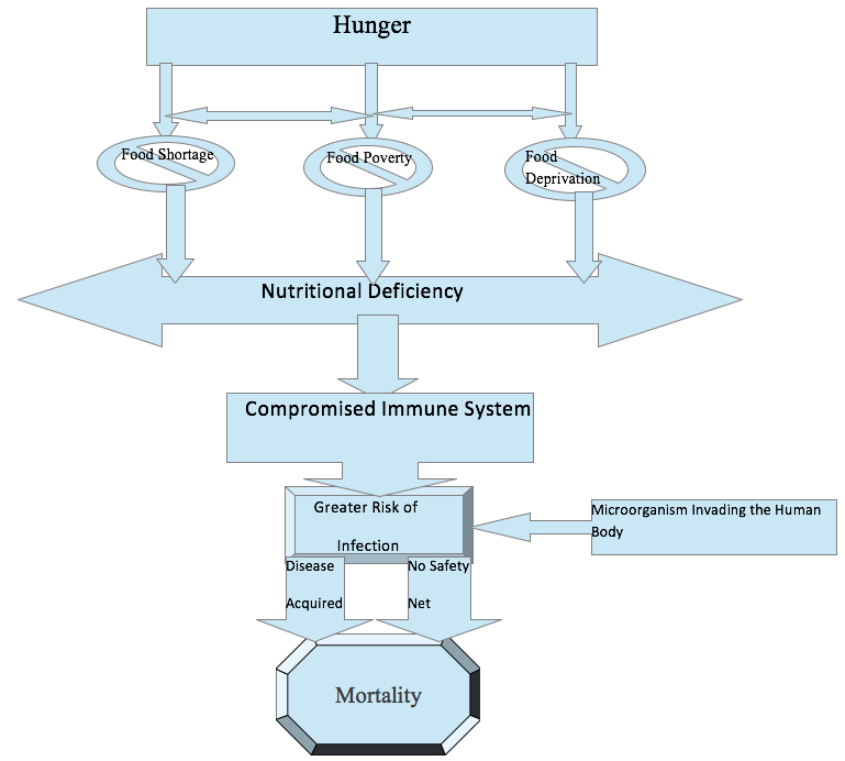 The below ‘Hunger-Mortality’ skeletal diagram explains how hunger (as a product of societal cause) causes mortality at individual or population level.
