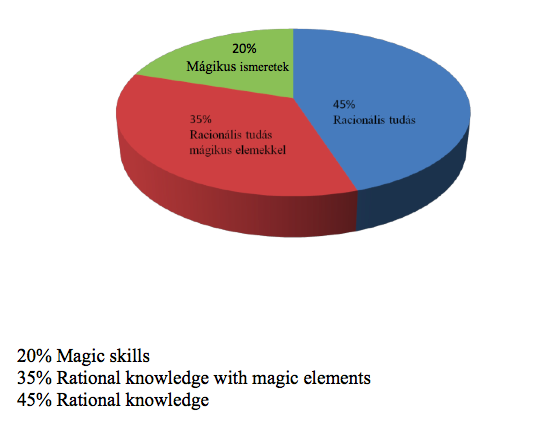 When examining the curing methods of the healer I found the following ratio: methods applying only rational elements make up 45% of her knowledge. These are mostly methods which use herbal ingredients: herbal tea, herbal compresses, ointments, rinses combined with heat therapy and inhalation. We must add however, that herbal treatments and their effects are not rejected by modern scientific medicine either.  Medical research institutes have carried out scientific research to find which plants and herbs used in rural medicine contain substances that have a healing effect7. The rational methods of the healer which also contain magical elements make up more than one third (35%) of her skills. Methods which only contain magical elements make up 20% of her medical knowledge.